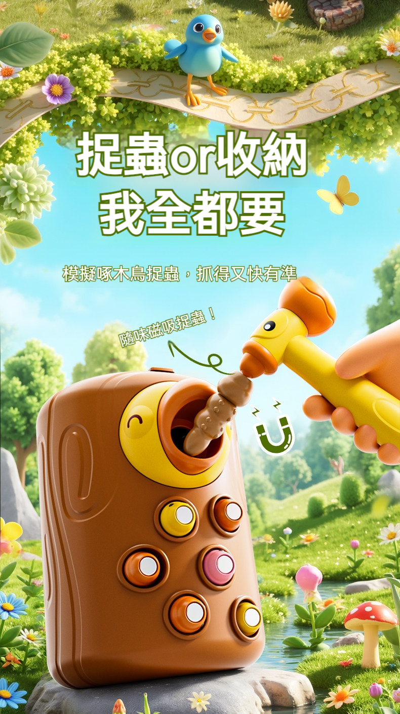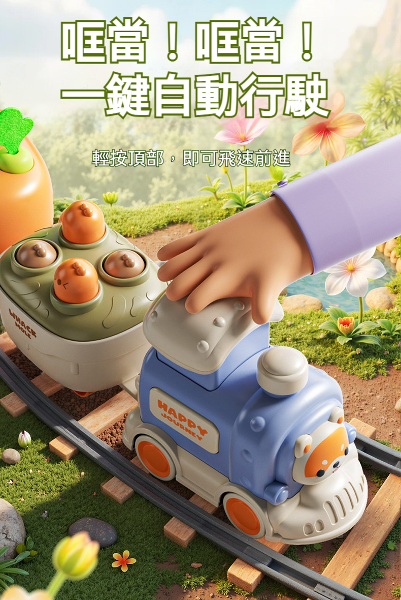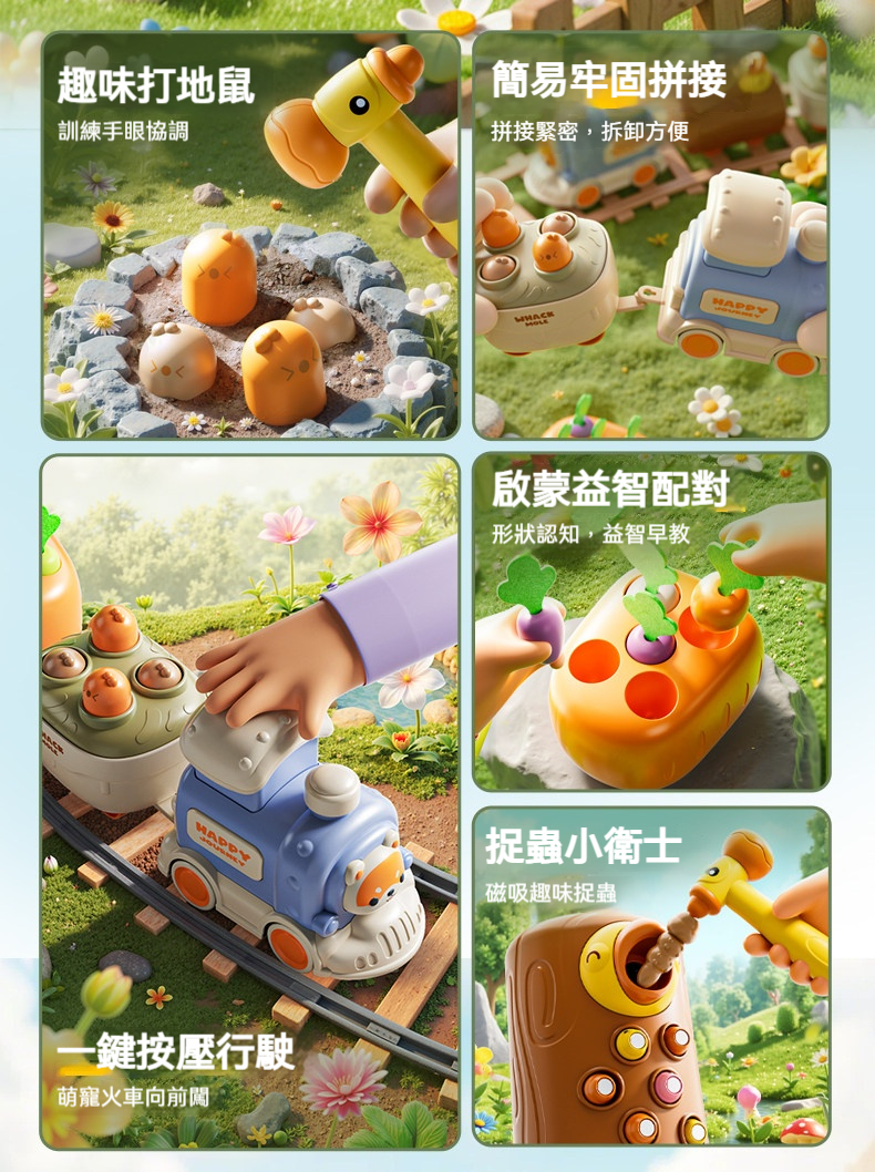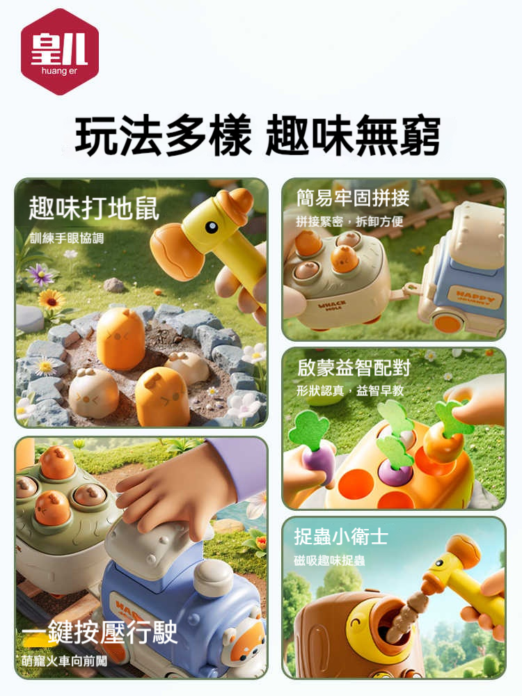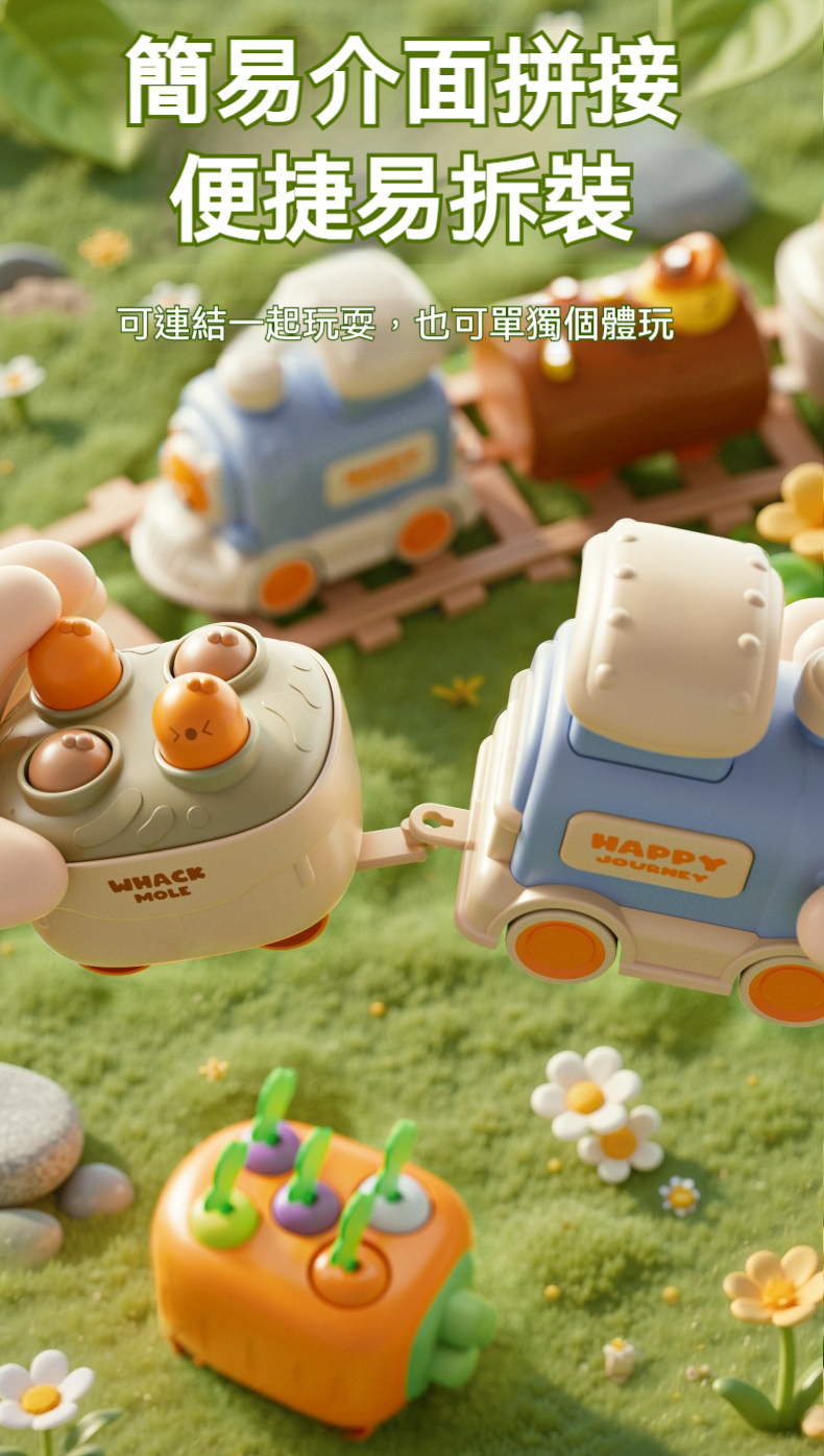 👍一鍵按壓火車頭,小火車向前衝衝衝!🐹打地鼠車訓練手眼協調|🥕蘿蔔車形狀配對啟蒙|🧲捉蟲車磁吸互動,化身勇敢小衛士!🔧車廂自由拼接,單玩/連玩都好玩🎁早教益智 × 動手動腦一次滿足